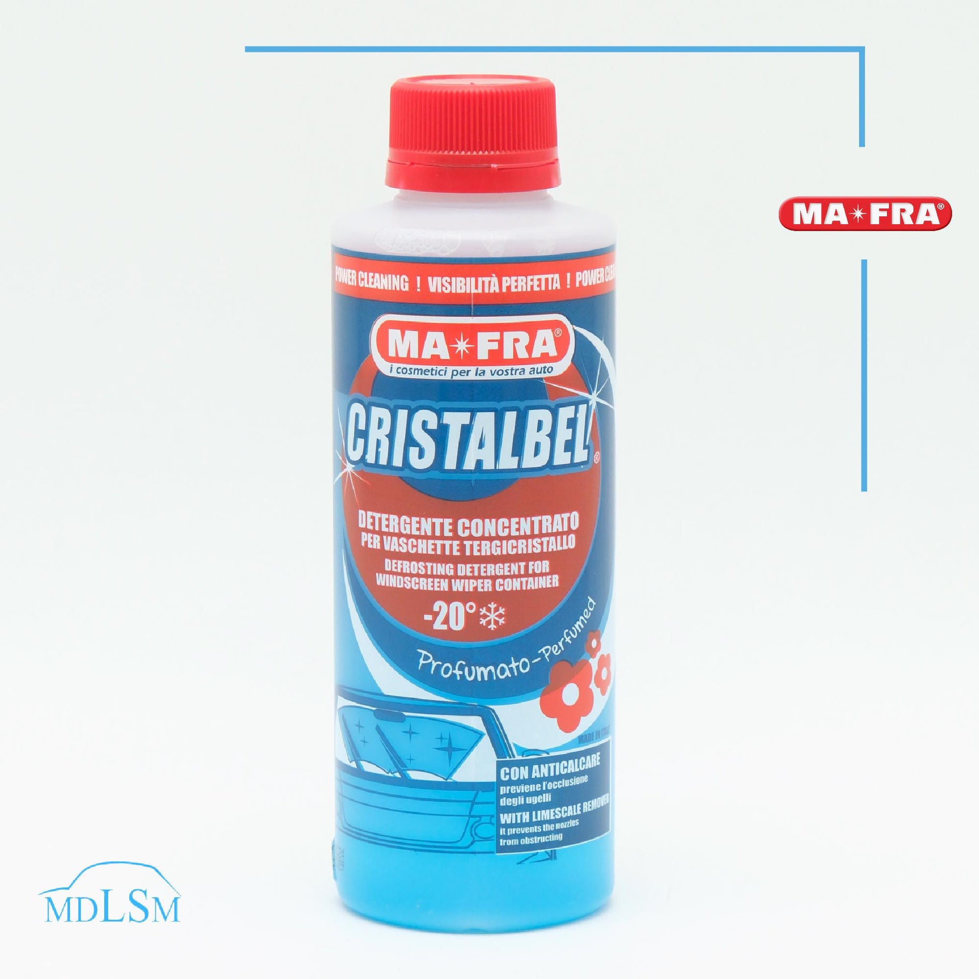 E’ un prodotto completo, capace di espletare un servizio apparentemente semplice ma in realtà di fondamentale importanza ai fini della sicurezza. Il suo nome è CRISTALBEL. Stiamo parlando di un liquido per pulire il parabrezza auto, funzione che svolge in maniera impeccabile. Pulire il parabrezza auto è una pratica importante per una perfetta visione sulla strada, e Cristalbel di Ma-Fra è il prodotto ideale. CRISTALBEL è un detergente completo: concentrato (ne basta davvero poco per avere un risultato ottimale) e adatto a tutte le stagioni, in grado, pertanto, di resistere anche alle basse temperature invernali (non congela sino a –20°). La sua particolare formulazione elimina completamente quel fastidioso saltellamento delle spazzole tergicristallo sul parabrezza e quel “rumore” che tante volte ci accompagna. CRISTALBEL, grazie alla sua azione anticalcare, mantiene pulito il circuito di erogazione eliminando qualsiasi incrostazione e prevenendone la formazione futura. Durante l’uso il suo gradevole profumo, inoltre, aumenta la “qualità della vita” all’interno dell’abitacolo.